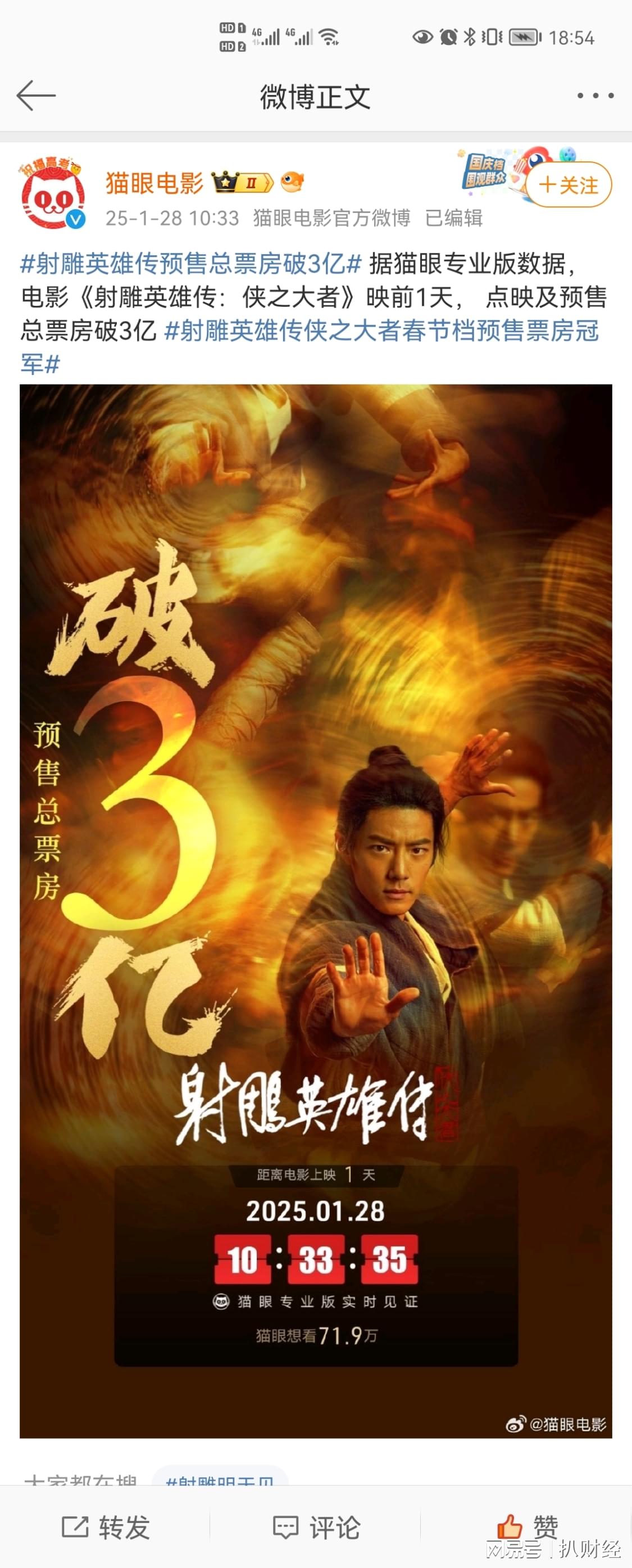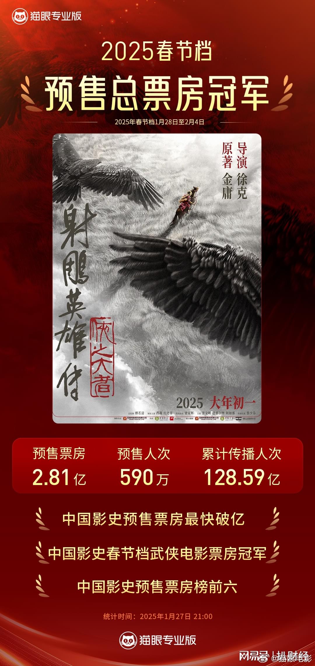 根据猫眼专业版披露,2025年春节档电影预售期间(1月19日-1月27日)总票房冠军为《射雕英雄传:侠之大者》,截至1月27日21点预售票房总额2.81亿元,随后在1月27日23:52预售票房突破3亿元,持续断层领先。