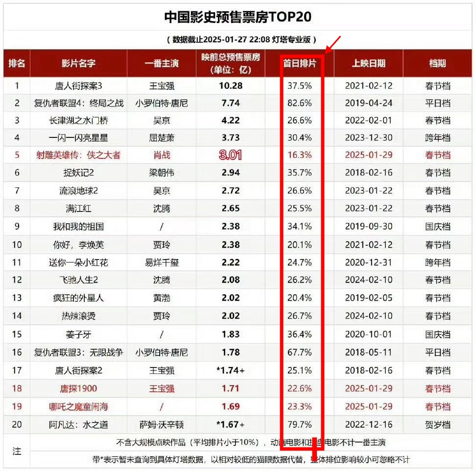 但不少网友注意到,《射雕英雄传:侠之大者》虽然预售票房快速突破3亿元遥遥领先,但其“首日排片”(即电影院安排的播放场次数量)始终徘徊在16%,在中国影史预售票房前二十影片中,都属最低。