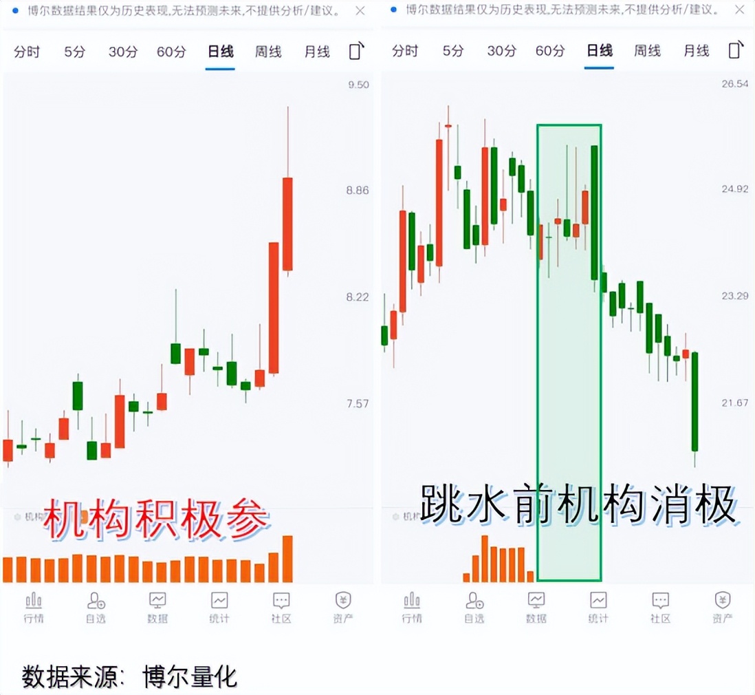 上图橙色「机构库存」数据是关键,它量化了机构的积极参与度。散户单看走势或基本面,容易被表象欺骗——机构可能故意打压股价制造恐慌,或拉高诱多。心理学上,这利用了“确认偏误”:散户只信符合自己预期的信号,忽略反面证据。结果呢?跌时以为末日来临,涨时幻想暴富。但「机构库存」像X光机,穿透迷雾。图中两只股票,因机构态度不同,命运迥异:一只「机构库存」持续,稳步上行;另一只缺失,陷入泥潭。量化数据还原了真相,让投资者看清谁在幕后操控。从心理角度,这打破了“控制幻觉”——散户总以为能掌控市场,实则数据才是导航仪。