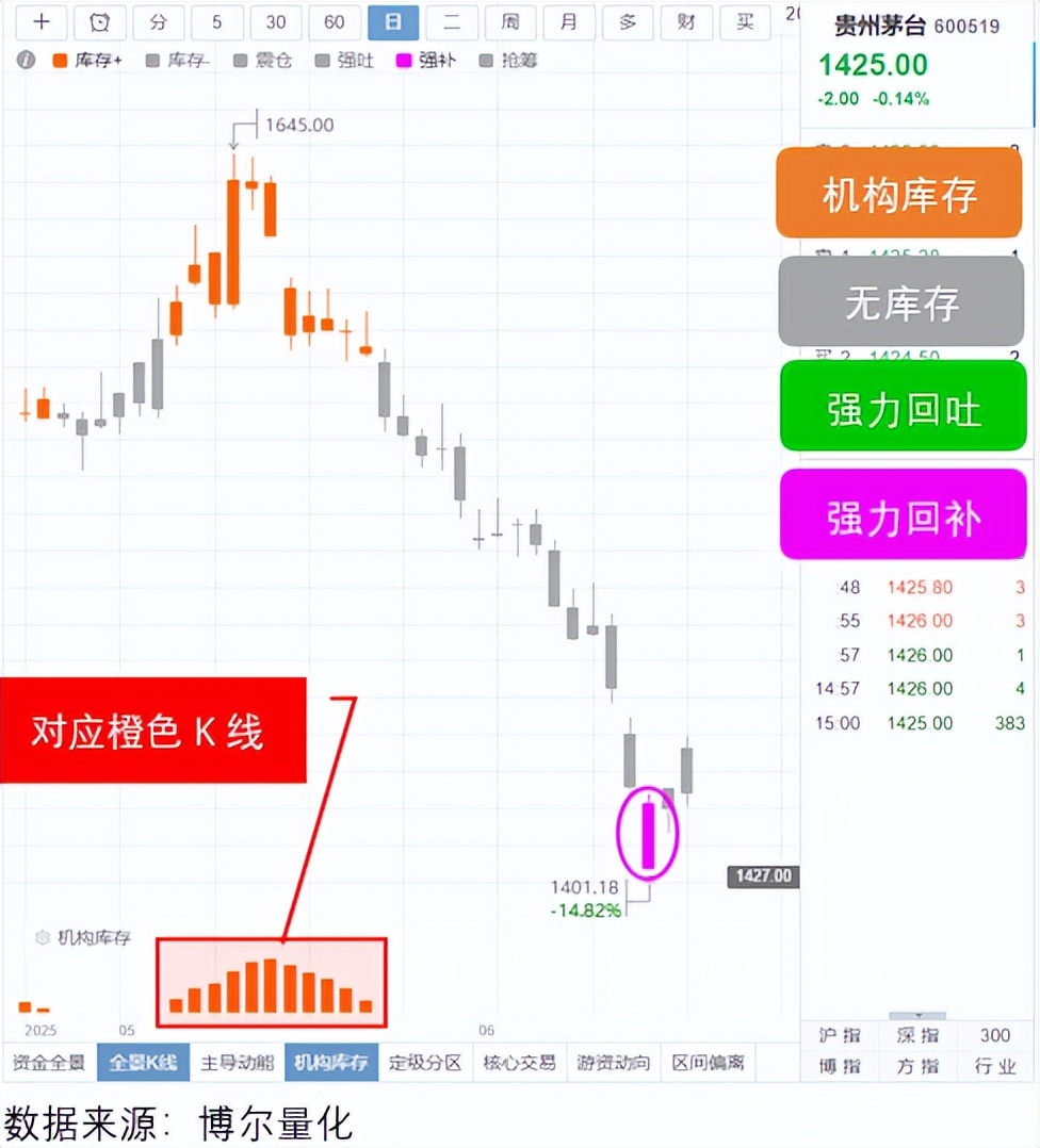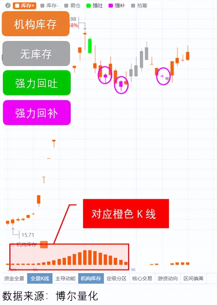 上文图中的橙色柱状,是我用系统观察的「机构交易特征」数据叫做「机构库存」。