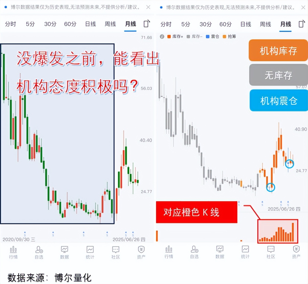 以某只新消费股票为例。它的股价在9.24行情后才开始翻倍上涨,但「全景K线」显示,「机构库存」早在2024年4月就已经出现(橙色K线)。更值得注意的是关键转折点出现的蓝色K线(蓝圈处),这代表典型的「机构震仓」行为。