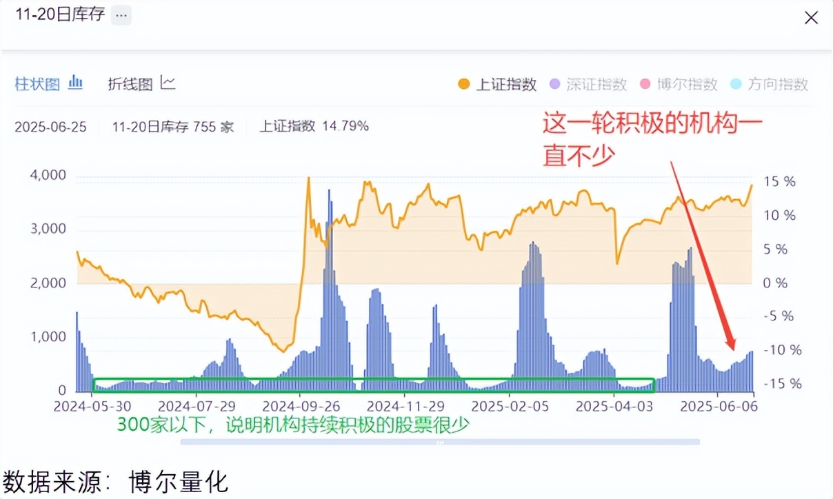 上文图中的橙色柱状,是我用系统观察的「机构交易特征」数据叫做「机构库存」。