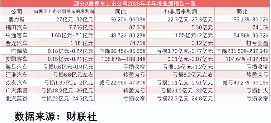 2025年上半年,11家A股上市车企的业绩预告显示,赛力斯净利润预计增长超66%,主要得益于与华为合作的问界系列高端车型。而江淮、广汽等传统车企则因新能源转型压力陷入亏损。表面看,这是新能源与传统车企的较量,但真相远不止于此。