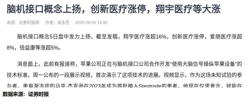 今天早上刷行情时,看到脑机接口概念股集体暴走,翔宇医疗涨超16%,创新医疗直接封板。市场里立马找原因,还是说脑机接口太牛了,那段实验室视频——渐冻症患者用思维操控iPad。科技发展的速度总是超乎想象。