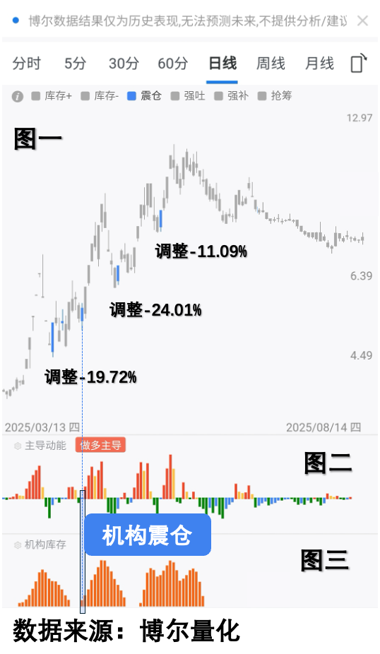 我们可以发现,其实前三轮调整过程中,最后都是以"机构震仓"现象收尾,说明这是机构在故意打压股价。但是到了后期,"机构库存"数据开始消失,这时候就不是机构在回补了,也就不是机构震仓,股价很难持续上涨了。