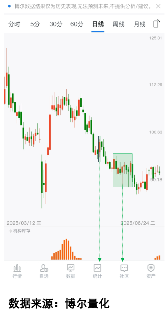 如果「机构库存」数据越活跃,那就意味着参与交易的机构资金越多,机构资金参与的时间也越长。