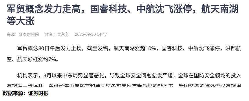 9月30日午后,A股市场军贸概念股集体发力的一幕让我陷入沉思。航天南湖大涨超10%,国睿科技、中航沈飞强势涨停的场景固然令人振奋,但作为一名深耕量化领域十年的投资者,我更关注的是这波行情背后的资金行为逻辑。
