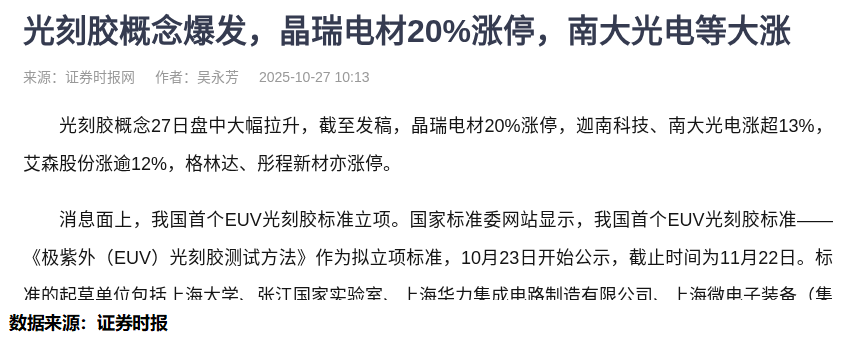 看着光刻胶概念股集体暴动,晶瑞电材20%涨停,南大光电涨超13%,我猜此刻大多数散户的心情就像站在奢侈品店橱窗外的路人——热闹是他们的,我什么都没有。