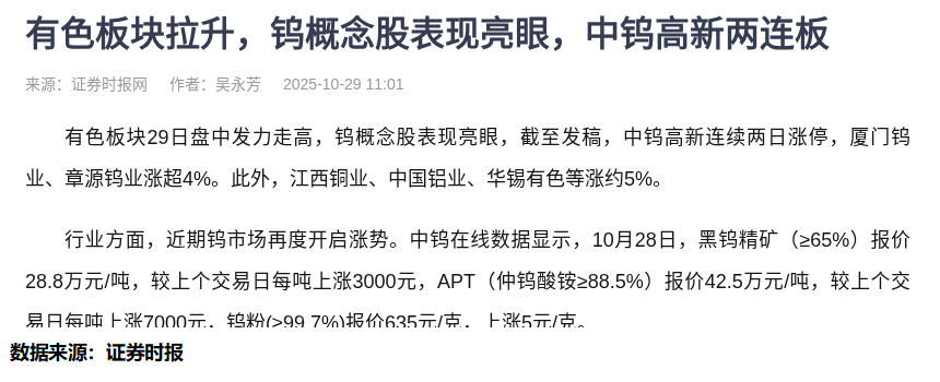 10月29日这天,我的手机被有色板块的行情推送刷屏了。中钨高新连续两日涨停,厦门钨业、章源钨业涨幅超4%,江西铜业这些老朋友也涨了约5%。看着这些熟悉的名字,我下意识地打开了量化数据系统。