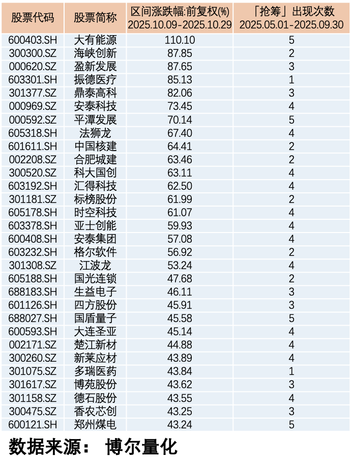 更令人惊讶的是,如果我们去掉K线走势,只看交易行为数据,这种资金共识现象会更加明显。在2025年10月9日到10月29日期间,涨幅前30家个股平均每只出现3.36次"抢筹"现象,远高于普通个股的频率。