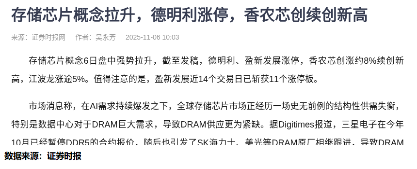 最近资本市场最热闹的莫过于存储芯片板块了。德明利、盈新发展接连涨停,香农芯创屡创新高,江波龙也表现不俗。特别是盈新发展,14个交易日11个涨停,这样的表现让人不禁想问:这背后到底发生了什么?