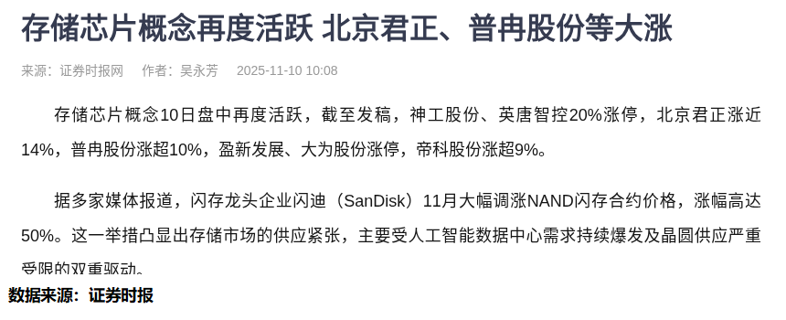 最近存储芯片行业炸开了锅。闪迪宣布NAND闪存涨价50%,美光等巨头纷纷跟进。神工股份、英唐智控这些概念股直接20cm涨停,北京君正涨14%,普冉股份涨10%…这行情,看得人热血沸腾。