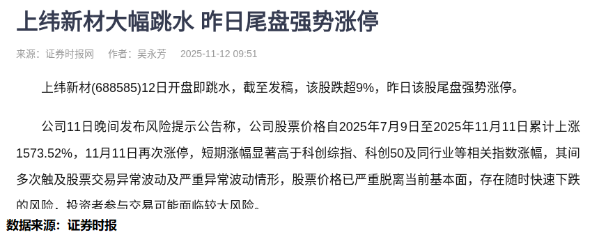 昨日涨停,今日暴跌9%——上纬新材(688585)的股价表演让人瞠目结舌。这家公司股价在短短四个月内累计涨幅高达1573.52%,却在今晨开盘即大幅下挫。更耐人寻味的是,就在暴跌前一天,一则关于"身高1.88米全尺寸机器人"的消息还在推波助澜。作为深耕量化领域多年的观察者,我深知这种戏剧性波动背后,往往隐藏着更值得玩味的市场密码。