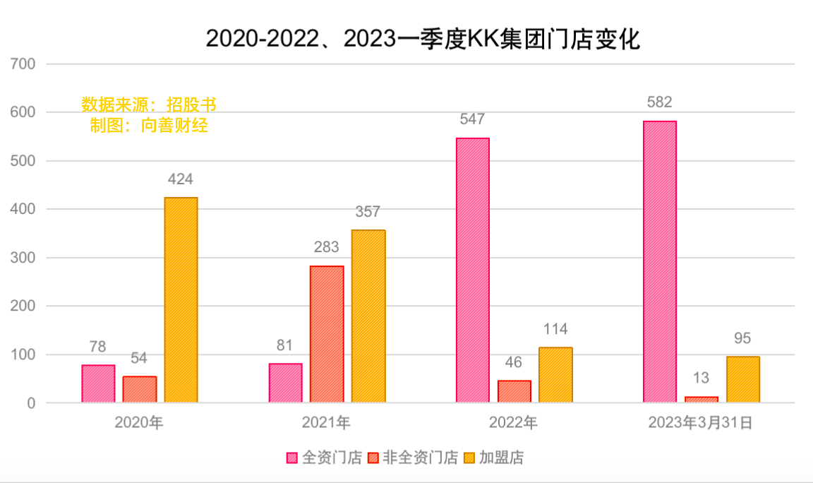 招股书显示,到2023年3月KK集团有690家门店。其中自营门店595家,加盟店95家。值得注意的是,一季度KK集团门店数量减少了22间。2021年到2022年,门店数量则从721家减少到707家。