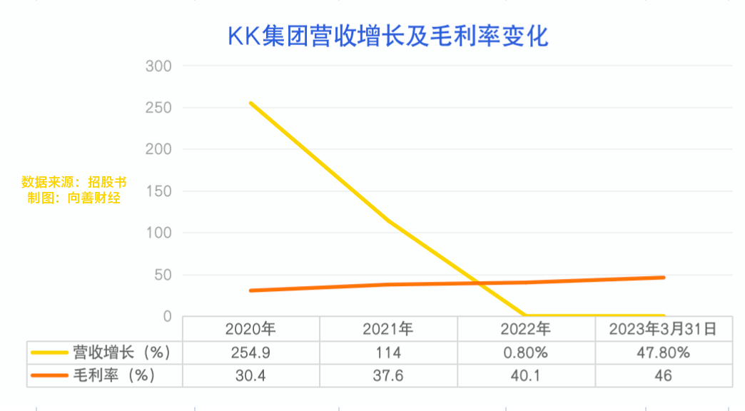 招股书显示,从2020年到2022年,KK集团的营收增长率从254%,下滑到114%,并在2022难下滑到了0.8%。