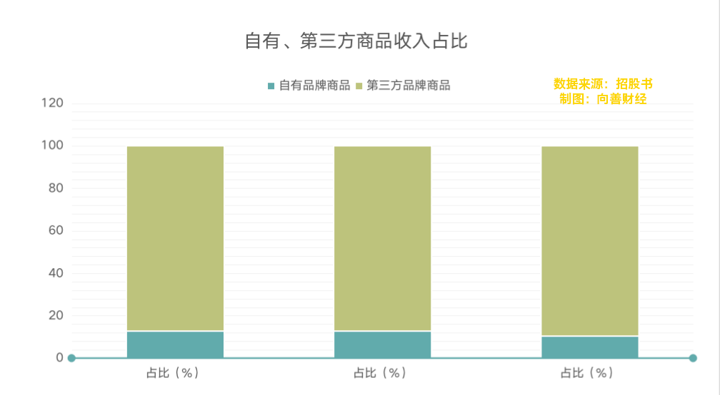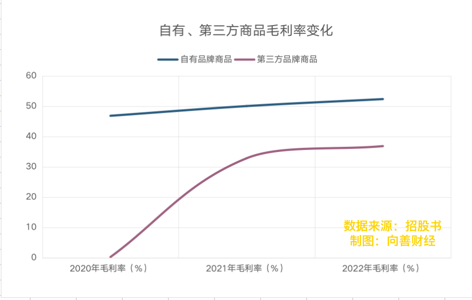 相比第三方品牌商品,自营品牌商品毛利率更高,能够达到50%左右。但招股书来看,自营品牌的营收占比在下降。