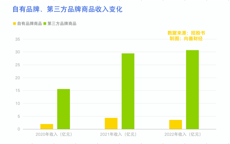 数据显示,2020年到2022年,公司自营品牌商品的营收占比分别为13%、13%、以及10.5%,占比进一步降低。