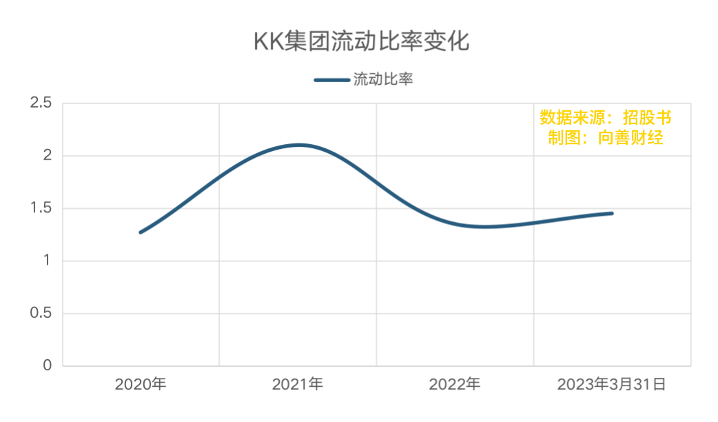流动性方面,2020年到2022年,KK集团的流动比率分别为1.27、2.1、1.45。一般而言,流动比率应该在2以上,也就是说,流动资产应该为流动负债的两倍以上,企业才有较强的偿债能力。