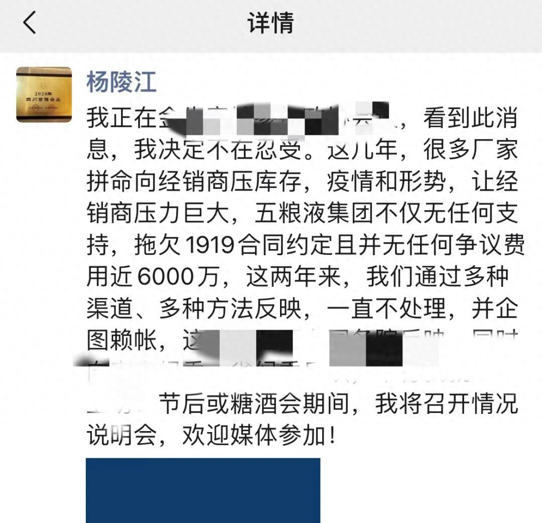 随后,一张酒类流通平台1919的董事长杨陵江怒斥“五粮液拖欠1919合同约定且无任何争议的费用近6000万”的朋友圈截图,便紧跟着在业内被疯狂传播。其中,杨陵江着重提到了白酒厂家在近年来对经销商们压库存所带来的经营压力。