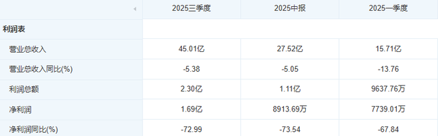 利润方面,第三季度归母净利润为7935.99万元,同比下滑72.58%;前三季度累计实现归母净利润1.69亿元,较2024年同期的6.26亿元大幅缩水72.99%。
