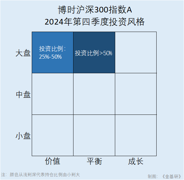 再比如,博时沪深300指数A,其主要大盘平衡风格的股票,投资比例大于50%,25%-50%的资产投资于大盘价值风格类型的股票。