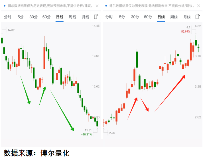 两只股票,一只调整后连涨四天,看似要起飞;另一只冲到高点就暴跌,像见顶信号。