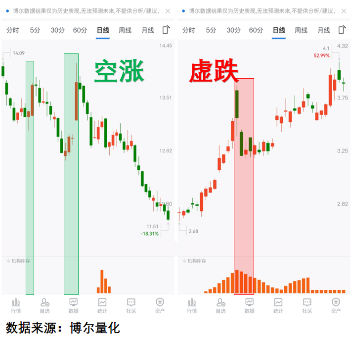 橙色柱子代表机构参与度。左边股票在涨,但橙色柱子没冒头——机构没参与,纯散户自嗨,自然没后劲;