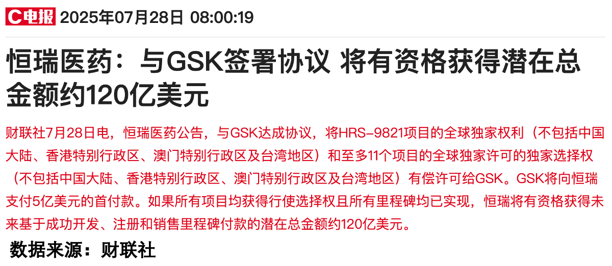 7月28日这则公告确实震撼:恒瑞医药将一款临床阶段呼吸系统创新药和11个候选项目的全球权益授权给GSK,潜在总金额高达125亿美元。消息一出,恒瑞股价应声大涨6%,创新药ETF也跟着水涨船高。