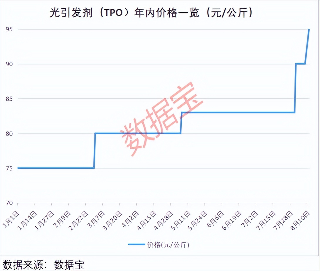 最近光引发剂价格暴涨的消息刷屏了。95元/公斤,单日涨幅5.56%,年内26.67%的涨幅,