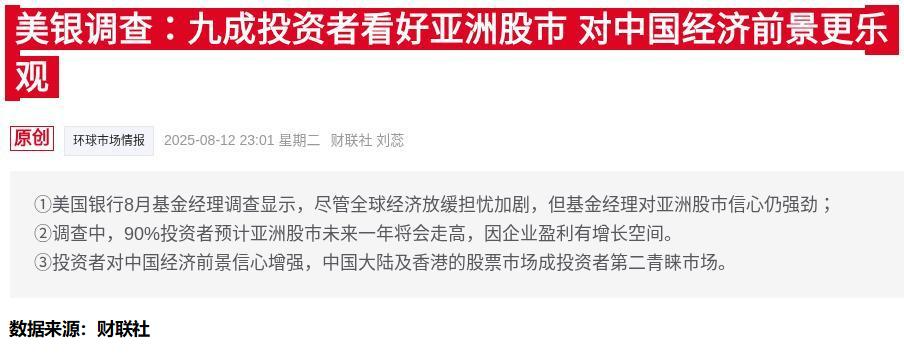 美国银行最新发布的8月基金经理调查报告显示了一个有趣的现象:尽管全球经济增长放缓的担忧加剧,但投资者对亚洲股市的信心却异常坚挺。这份覆盖197名基金经理、管理资产达4750亿美元的调查报告揭示了一个看似矛盾的市场现象。
