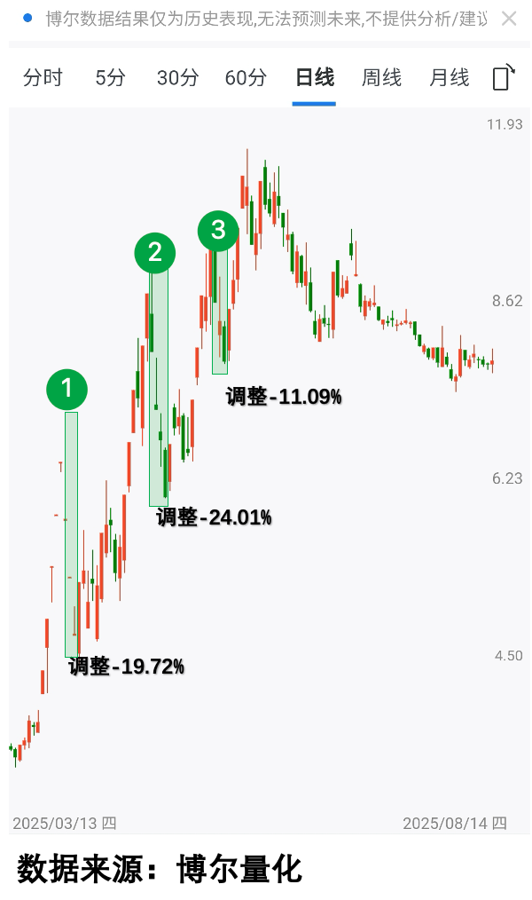 看看这张图上的三次剧烈调整:第一次跌15%,第二次近30%,第三次又是20%的深蹲。在已经上涨一段时间的背景下,这种调整足以让绝大多数散户夺路而逃。结果呢?这只股票四个月接近翻倍。那些被震出去的投资者,只能望洋兴叹。