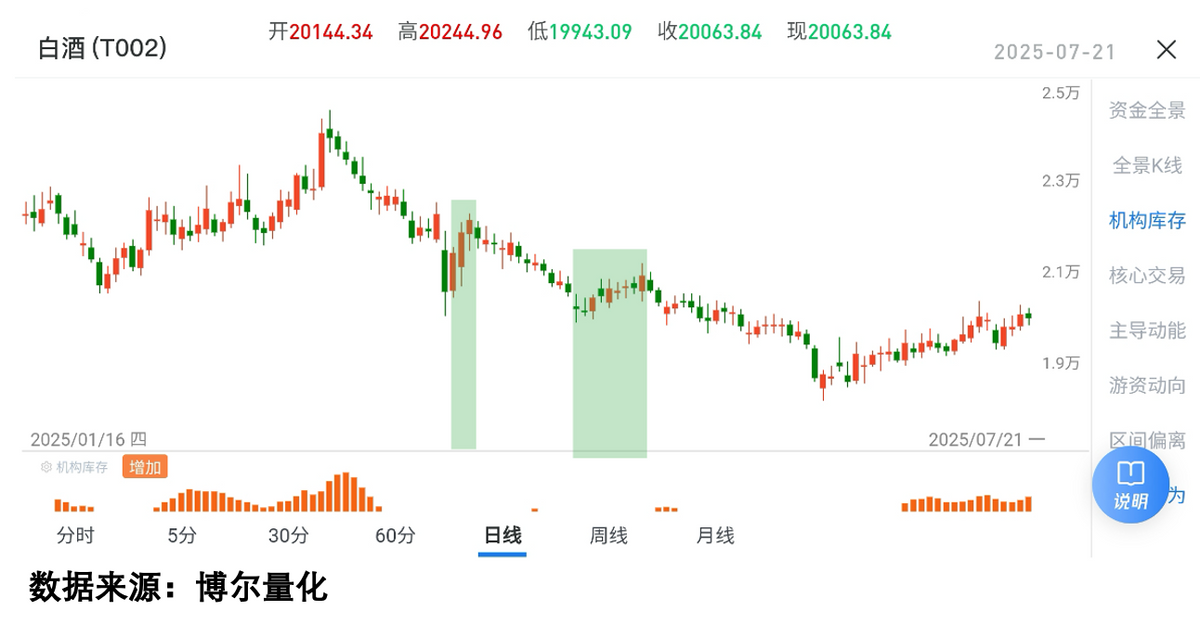 这张白酒板块的交易行为数据图清晰地告诉我们答案。图中橙色柱体反映的是机构资金活跃程度的"机构库存"数据。可以看到两段绿色框内股价虽然出现反弹,但都没有"机构库存"数据活跃的迹象,说明机构资金根本不看好白酒。更值得注意的是,在年初这波反弹结束后,机构资金就已经不再积极参与交易。
