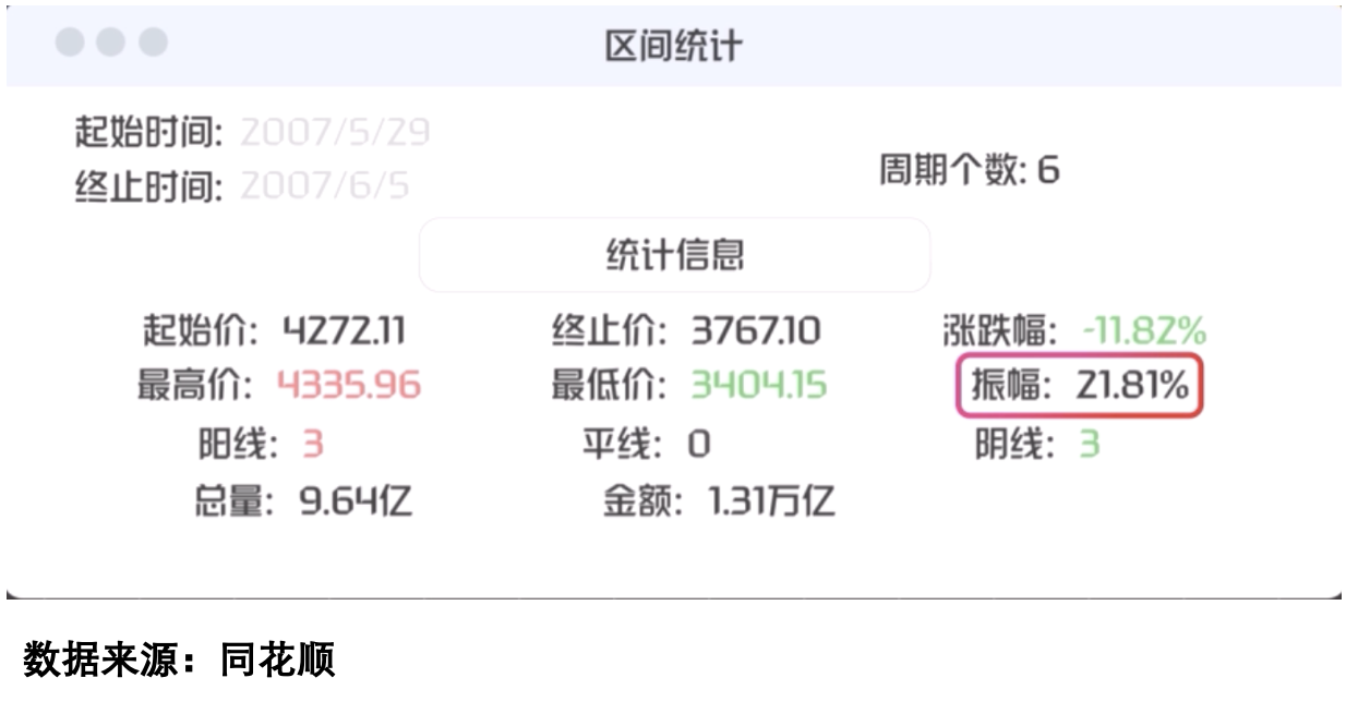 更可怕的是牛市的调整幅度。随便截取2007年牛市中的一次调整为例:在一路上扬的直线里,下跌往往难以察觉。但事实是仅仅6天时间,大盘就下跌了22%。这可是大盘指数啊!个股下跌30-40%甚至腰斩的更是不计其数。