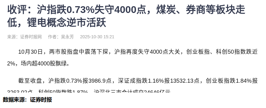 10月30日,A股市场再度上演惊心动魄的一幕。沪指跌0.73%,收报3986.9点,4000点大关得而复失;深证成指跌1.16%,创业板指更是重挫1.84%。两市超4000只个股下跌,成交额却维持在2.4万亿的高位。