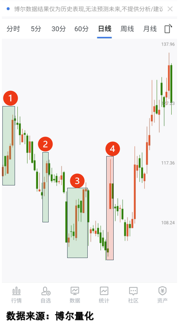 我的量化系统用红黄蓝绿四色柱体标记四种交易行为: