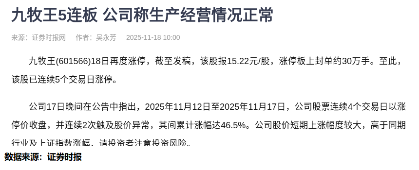 看着九牧王连续五个交易日封死涨停板,我的手机都快被朋友们的消息挤爆了。这帮平时潜水的老伙计,现在个个像打了鸡血似的追问我:"老张,这票还能不能追?"我盯着那张走势图直摇头——15.22元的股价,30万手封单,46.5%的累计涨幅,活脱脱就是A股版的"速度与激情"。