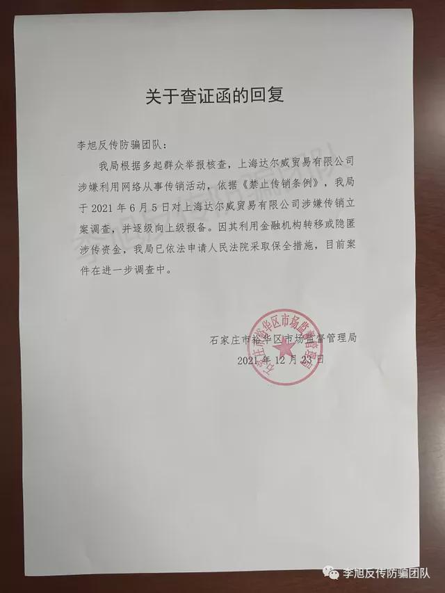 近日,石家庄市裕华区市场监督管理局以《查证函回复》的形式,公开披露了达尔威涉嫌利用网络从事传销活动被查处的进展。