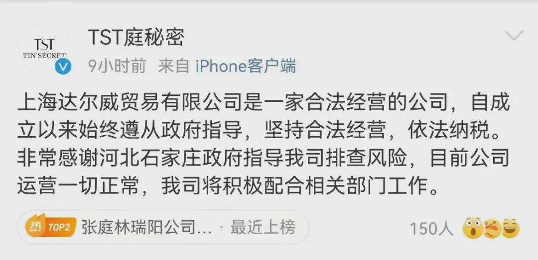29日凌晨,张庭夫妇旗下的“TST庭秘密”在官方微博回应称,上海达尔威是一家合法经营的公司,自成立以来始终遵从政府指导,坚持合法经营,依法纳税;非常感谢河北石家庄政府指导公司排查风险,目前公司运营一切正常,公司将积极配合相关部门工作。