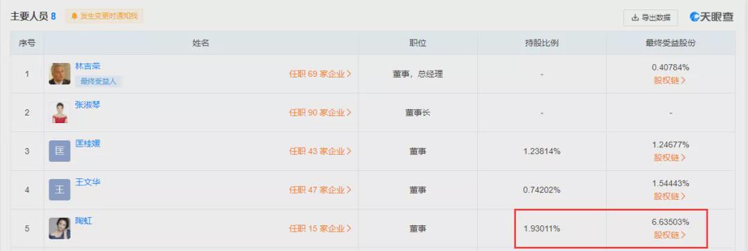 值得一提的是,林瑞阳、张庭旗下的上海达尔威贸易有限公司中,知名演员陶虹也占一定比例的股份。