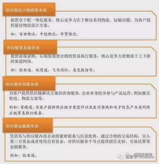 供应链服务涉及领域较多,按照其服务重心以及核心竞争力体现可以将供应链企业主要分为四类: