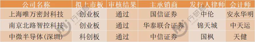 顺利过会的公司为:上海唯万密封股份有限公司、南京北路智控科技股份有限公司、中微半导体(深圳)股份有限公司。