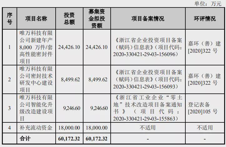 唯万密封拟募集资金60,172.32万元,投入到三个建设项目以及一个补充流动资金项目中。其中,补充流动资金项目总投资额为18,000.00万元,新建年产8,000万件/套高性能密封件项目铺底流动资金为5,023.28万元,智能化升级改造建设项目铺底流动资金为1,466.80万元,合计补流24,490.08万元,占募集资金投资额的比例为40.70%。