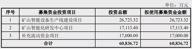 此次IPO拟募资60836.72万元,共用于3个项目,分别是用于矿山智能设备生产线建设项目、矿山智能化研发中心项目及补充流动资金: