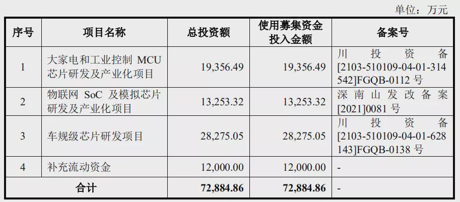 本次IPO中微半导拟募资72,884.86万元,主要用于大家电和工业控制MCU芯片研发及产业化项目,使用募集资金投入金额约1.94亿元;物联网SoC及模拟芯片研发及产业化项目,使用募集资金投入金额约1.33亿元;车规级芯片研发项目,使用募集资金投入金额约2.83亿元;补充流动资金,使用募集资金投入金额1.20亿元。