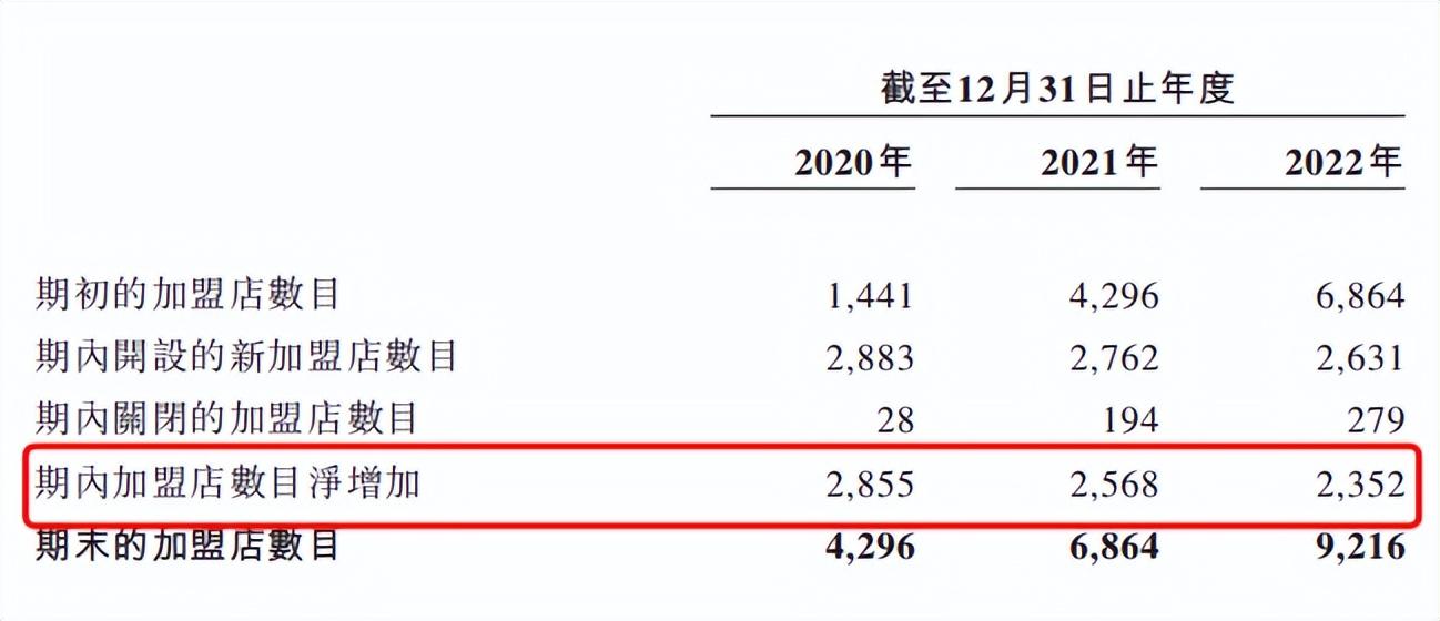 不过,值得关注的是,锅圈食汇的闭店率一直在持续上升,2020年至2022年,净增加2855家、2568家、2352家,期内关闭的加盟店数量为28家、194家、279家。近三年关闭的门店数量占比分别为0.7%、2.8%、3%。