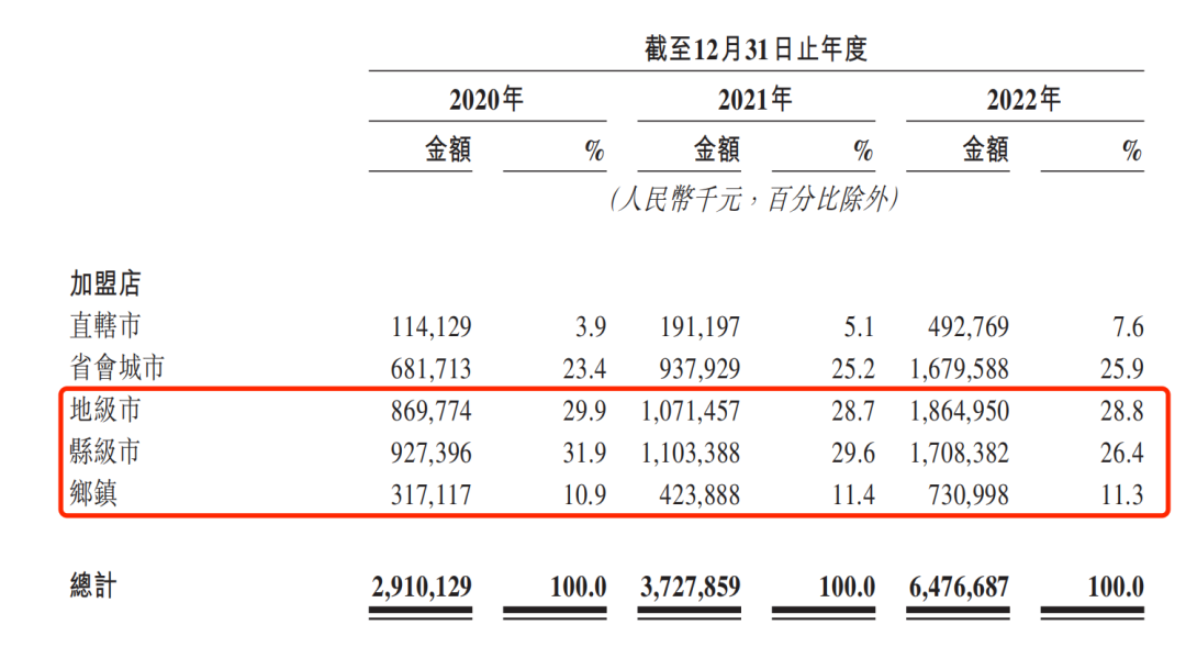 据招股书显示,锅圈食汇加盟店在地级市、县级市两地贡献的收入占比是最多的。2022年,加盟店地级市销售收入达18.65亿元,县级市销售收入达17亿元,两者加起来占了总销售的55.2%。2022年,地级、县乡镇锅圈食汇加盟店总销售收入占比达92.4%。