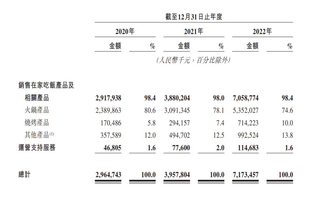 从招股书来看,锅圈食汇的营收也大多来自于加盟商,虽然不收加盟费,但零售门店的快速铺开使其营收也大幅翻升。据招股书,锅圈食汇几乎所有销售收入都来自向加盟商销售自有产品,加盟商向终端消费者销售产品。近三年,锅圈食汇销售在家吃饭产品及相关产品占据总收入的98%以上,其中火锅产品更是占据总收入的绝大部分,近三年占比分别为80.6%、78.1%及74.6%。
