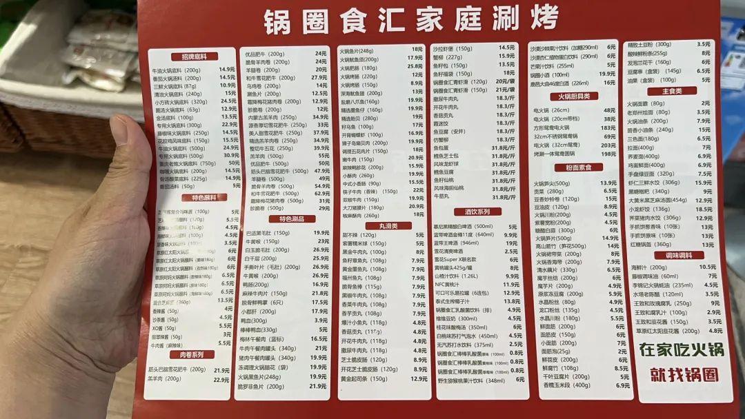 翻看锅圈食汇的火锅菜单,价格带从2元到50元左右不等。和其他品牌的食材相比,价格并并不便宜,甚至更贵。例如锅圈食汇的牛油火锅底料200g价格为14.9元,而海底捞牛油火锅底料150g*3包在电商平台购买价格在20元出头,如果换算成200g的产品价格仅为10元左右。