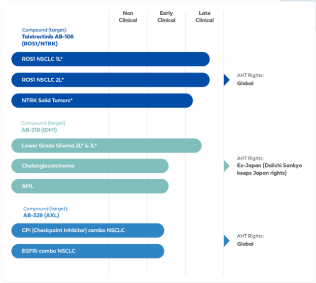 葆元医药成立之初通过授权引进第一三共的3款药物,获得药物全球或日本以外商业化权利开始公司业务。其中,Taletrectinib是葆元医药正在开发的一款高效的、高选择性的可以穿过血脑屏障的针对ROS1突变和NTRK突变双靶点的下一代酪氨酸激酶抑制剂(TKI),葆元医药从第一三共引进获得其全球商业化权利。