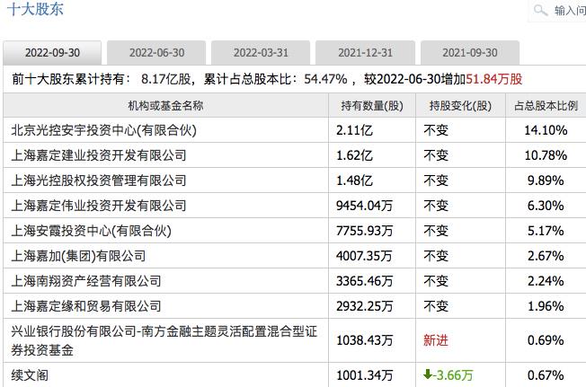 现在我们打开十大股东来看,①③⑤⑥背后都是光大控股,②④⑦是嘉定国资或者集体经济;光大控股持股在31.9%,为第一大股东;